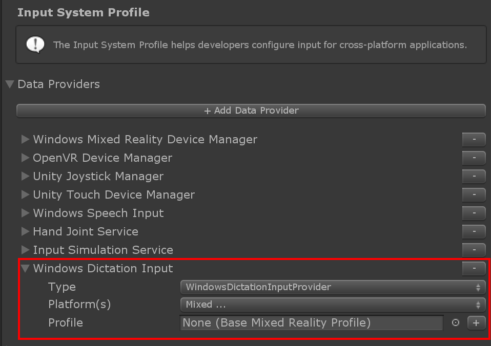 Dictation allows users to record audio clips and obtain a transcription. To use it make sure that a dictation system is registered in the Input System Profile. Windows Dictation Input Provider is the dictation system provided out of the box but alternative dictation systems can be created implementing IMixedRealityDictationSystem.