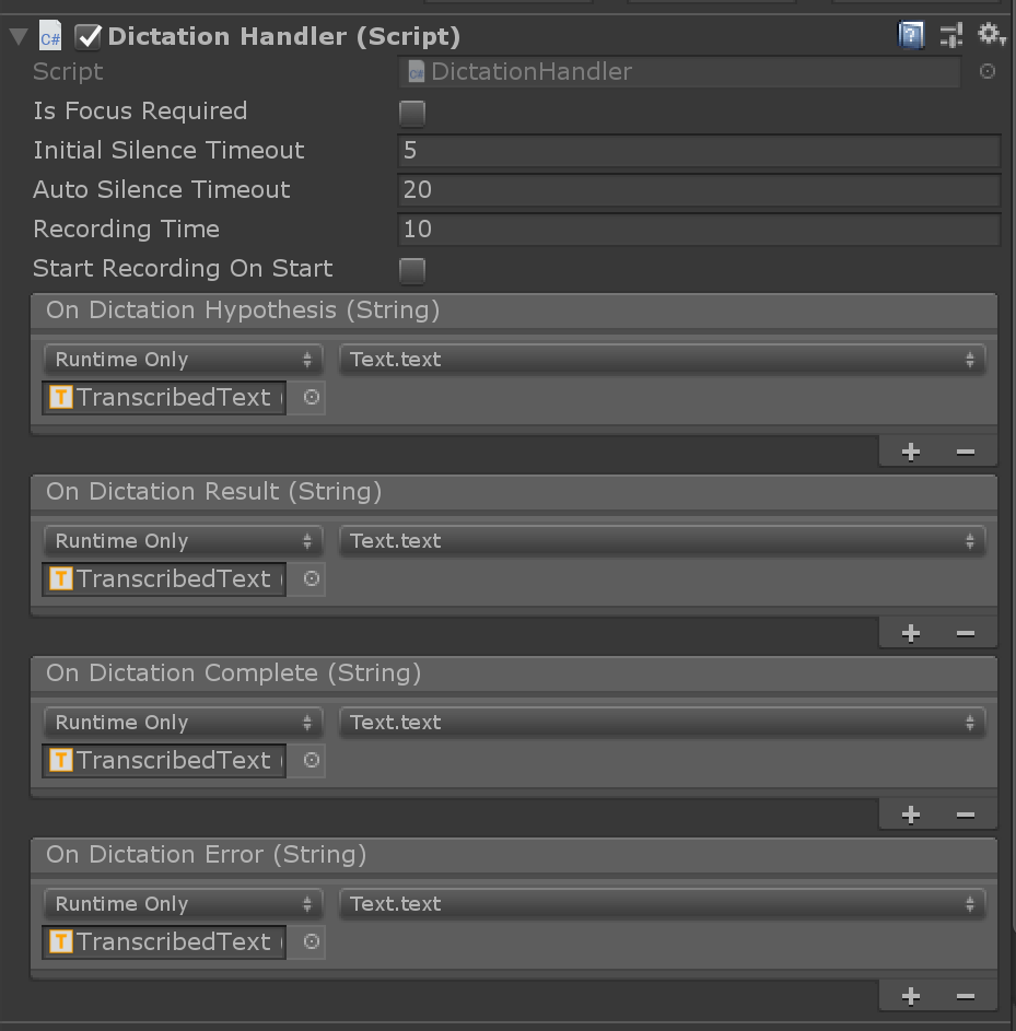 Once you have a dictation service set up, you can use the DictationHandler script to start and stop recording sessions and obtain the transcription results via UnityEvents.